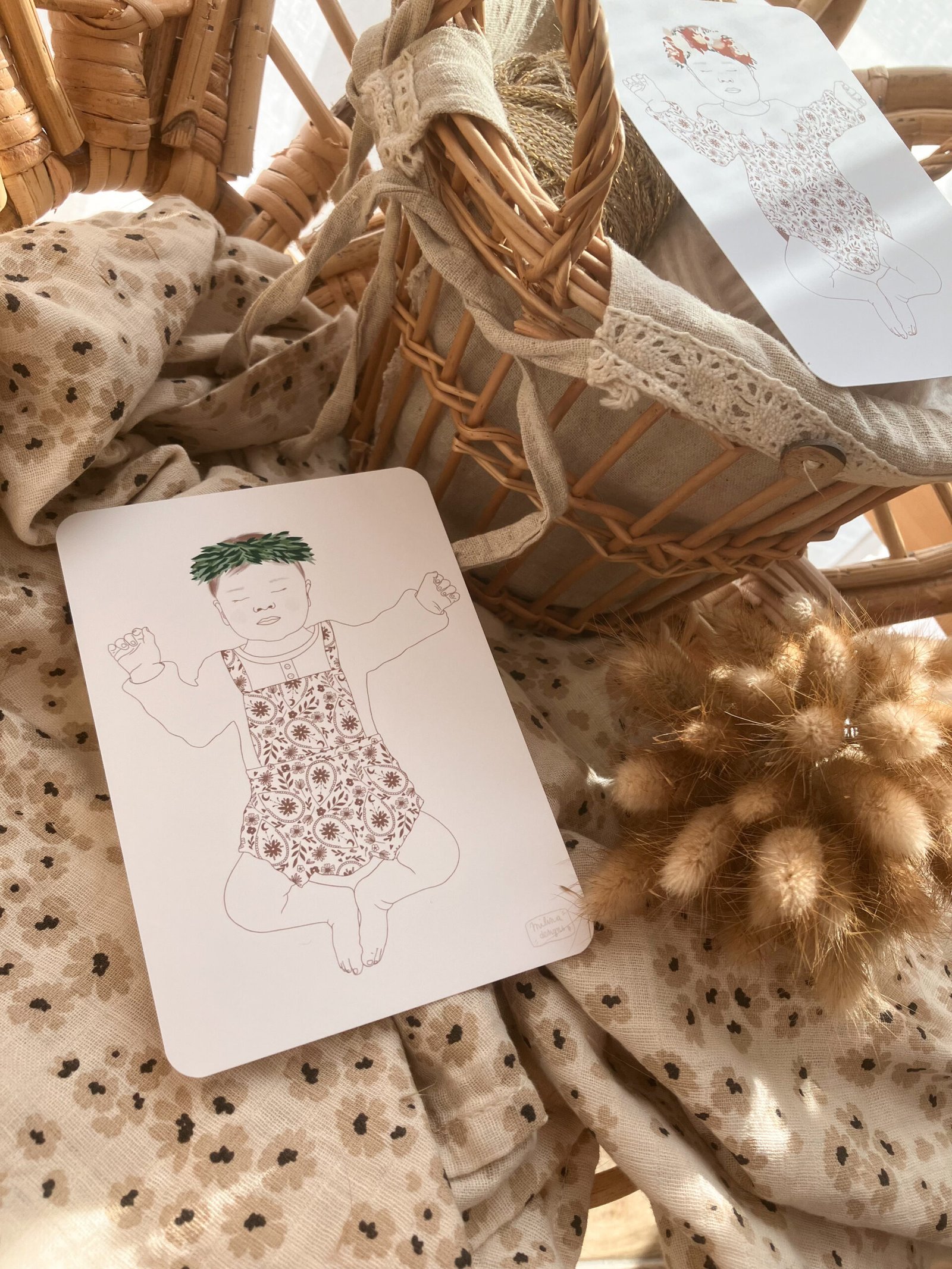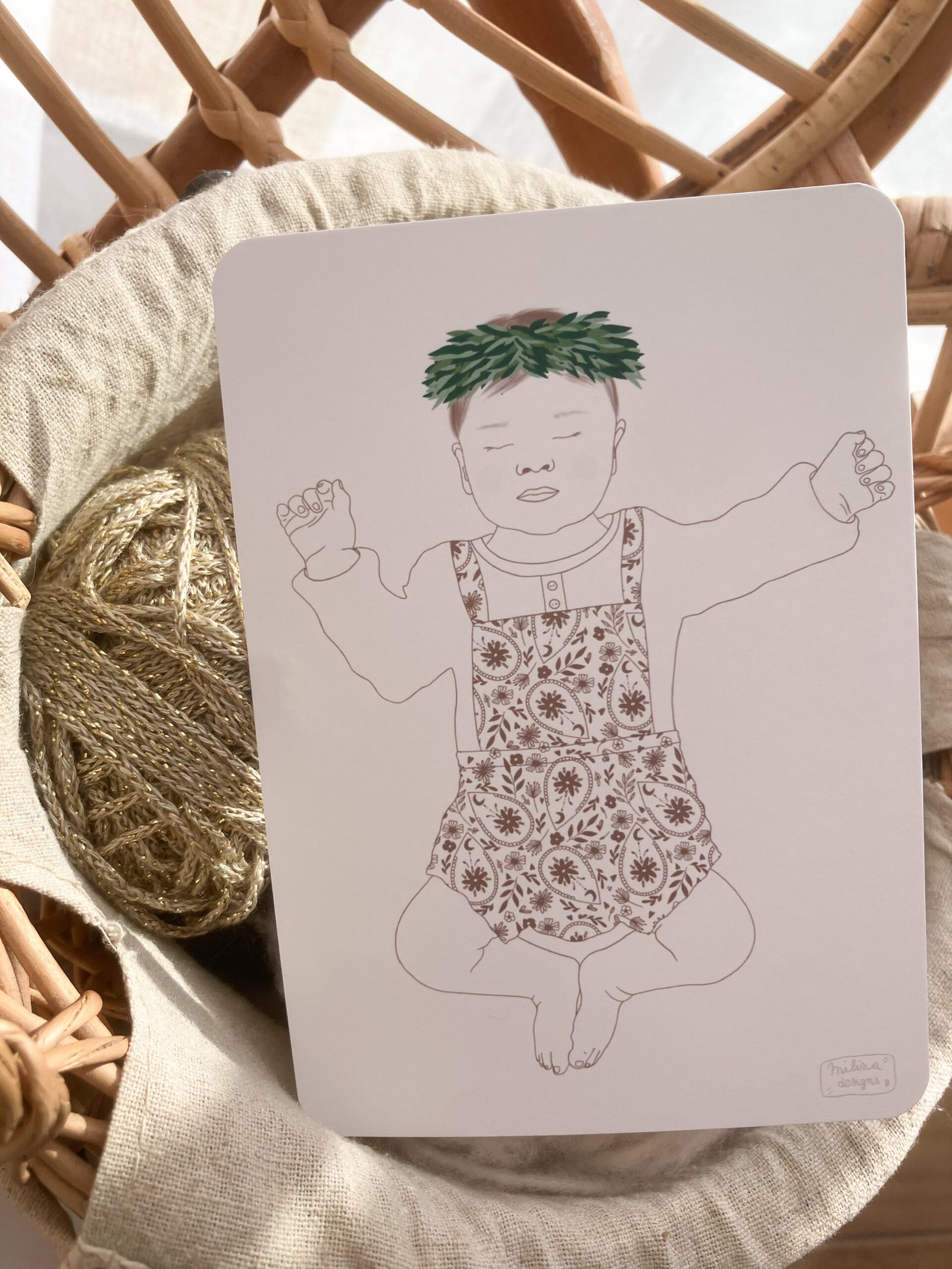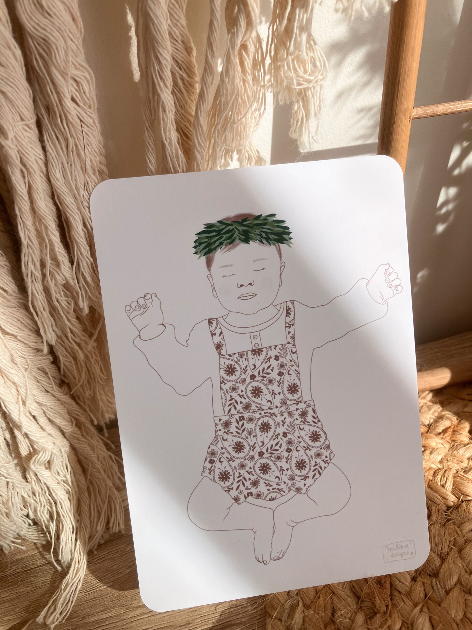 Cette douce carte représente un doux bébé façon croquis avec sa jolie couronne d’olivier et sa tenue bohème 🤎
