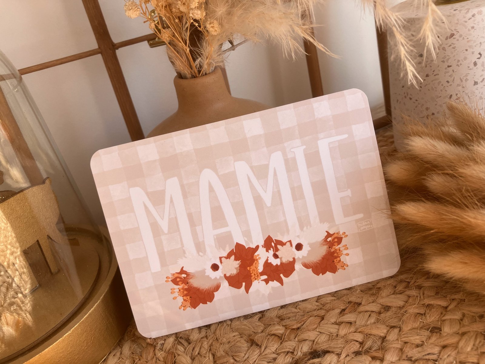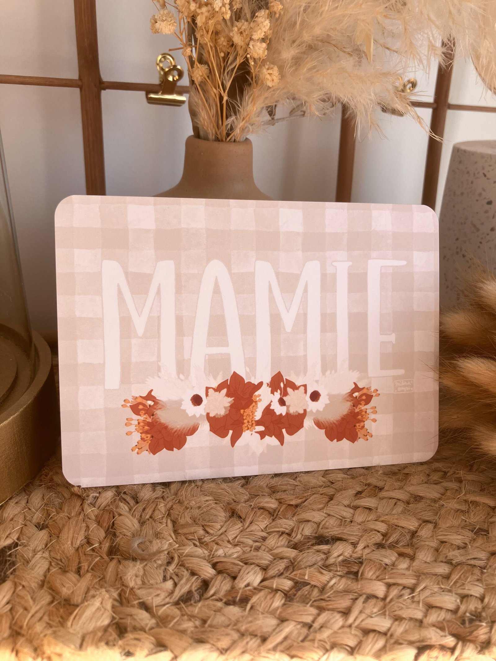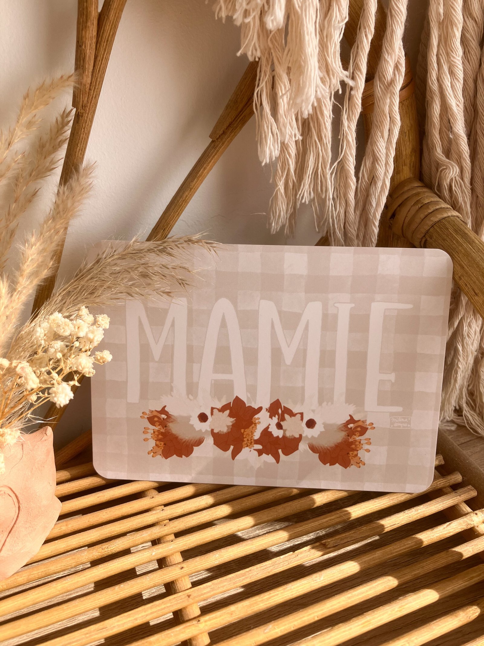Cette jolie carte aux couleurs douces, avec ses fleurs et son motif vichy très tendance décorera à merveille vos jolis murs ou sera une petite attention idéale à offrir .